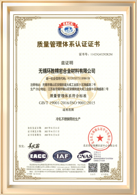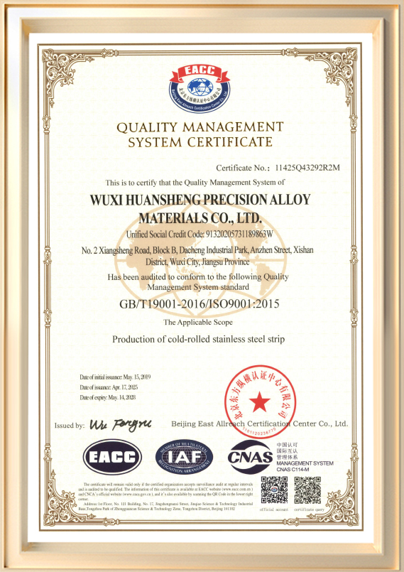 تأسست شركة Wuxi Huansheng Precision Alloy Materials Co., Ltd. (المعروفة سابقًا باسم Wuxi Huansheng Metal Products Co., Ltd.) في عام 2001، وهي شركة تصنيع متخصصة تعمل في مجال البحث والتطوير وإنتاج شرائح الفولاذ المقاوم للصدأ المدرفلة على البارد. تمتلك الشركة رأس مال مسجل قدره 60 مليون يوان صيني ومساحة مصنع تبلغ حوالي 45,990 مترًا مربعًا، مع قدرة إنتاجية سنوية تصل إلى 72,000 طن. يتراوح سمك المنتج من 0.03 ملم إلى 3.0 ملم، وبأقصى عرض 550 ملم.